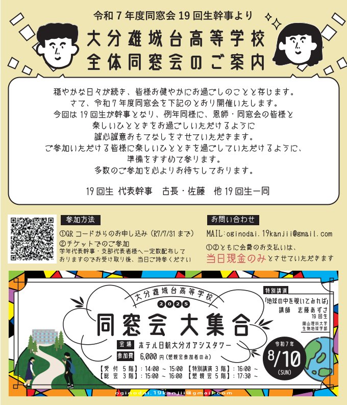 ゲストは大分雄城台高校19回生の古長寛幸さんです。古長さんは雄城台高校同窓会副会長も務めていて、スタジオゲストはもちろん、50周年記念の会場、全体同窓会会場など様々場面でお話をうかがっています。今回は、今年開催される全体同窓会の代表幹事としてのお話を中心にうかがいます。